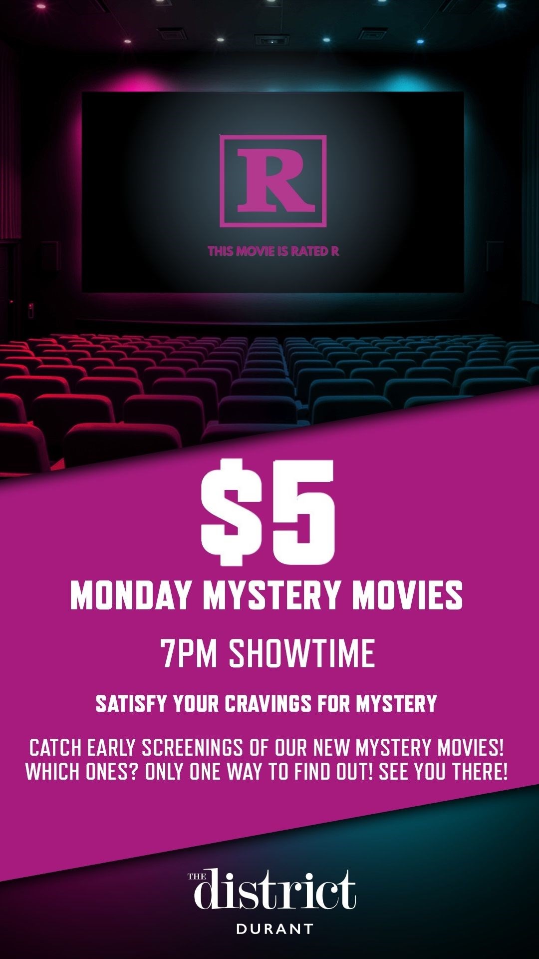 The District The District Cinema Description US-75 Durant OK Parking Public Transport Key: 3D 4K CC AD ALD Dolby Atmos Heated Seat Recliners Print Preview Showtimes Play Trailer The Super Mario Galaxy Movie Hide Future Dates Show Future Dates Monday, 20 April 2026 11:30 AM 01:15 PM 03:00 PM 04:15 PM 06:00 PM 09:10 PM 10:00 PM Tuesday, 21 April 2026 11:30 AM 01:30 PM 03:00 PM 04:30 PM 06:00 PM 07:30 PM 09:00 PM 10:15 PM Wednesday, 22 April 2026 11:30 AM 12:30 PM 02:30 PM 03:30 PM 06:00 PM 09:00 PM Play Trailer Project Hail Mary Hide Future Dates Show Future Dates Monday, 20 April 2026 12:00 PM 04:00 PM 08:00 PM Tuesday, 21 April 2026 12:00 PM 04:00 PM 08:00 PM Wednesday, 22 April 2026 12:00 PM 04:00 PM 08:00 PM Play Trailer You, Me & Tuscany Hide Future Dates Show Future Dates Monday, 20 April 2026 12:30 PM 03:30 PM 06:30 PM 09:30 PM Tuesday, 21 April 2026 12:30 PM 03:30 PM 06:30 PM 09:30 PM Wednesday, 22 April 2026 12:30 PM 03:30 PM 06:30 PM 09:30 PM Mystery Movie - 4/20 Hide Future Dates Show Future Dates Monday, 20 April 2026 07:00 PM Play Trailer Lee Cronin's The Mummy Hide Future Dates Show Future Dates Monday, 20 April 2026 11:30 AM 02:45 PM 06:00 PM 09:15 PM Tuesday, 21 April 2026 11:30 AM 02:45 PM 06:00 PM 09:15 PM Wednesday, 22 April 2026 11:30 AM 02:45 PM 06:00 PM 09:15 PM Fight Club (4K Remaster) Hide Future Dates Show Future Dates Wednesday, 22 April 2026 06:30 PM Play Trailer Michael Hide Future Dates Show Future Dates Thursday, 23 April 2026 07:15 PM Friday, 24 April 2026 12:30 PM 03:45 PM 07:00 PM 10:15 PM Saturday, 25 April 2026 12:30 PM 03:45 PM 07:00 PM 10:15 PM Sunday, 26 April 2026 12:45 PM 04:00 PM 07:15 PM Play Trailer The Devil Wears Prada 2 Hide Future Dates Show Future Dates Thursday, 30 April 2026 04:45 PM 06:30 PM 07:45 PM Friday, 01 May 2026 10:15 AM 12:00 PM 01:30 PM 03:15 PM 04:45 PM 06:30 PM 08:00 PM 09:45 PM 11:15 PM Saturday, 02 May 2026 10:15 AM 12:00 PM 01:30 PM 03:15 PM 04:45 PM 06:30 PM 08:00 PM 09:45 PM 11:15 PM Sunday, 03 May 2026 10:15 AM 12:00 PM 01:30 PM 03:15 PM 04:45 PM 06:30 PM 08:00 PM 09:45 PM Play Trailer Mortal Kombat II Hide Future Dates Show Future Dates Thursday, 07 May 2026 03:15 PM 06:30 PM 09:35 PM Friday, 08 May 2026 10:30 AM 01:30 PM 04:30 PM 07:30 PM 10:30 PM Saturday, 09 May 2026 10:30 AM 01:30 PM 04:30 PM 07:30 PM 10:30 PM Sunday, 10 May 2026 12:30 PM 03:30 PM 06:30 PM 09:30 PM Star Wars: The Mandalorian and Grogu Hide Future Dates Show Future Dates Thursday, 21 May 2026 02:30 PM 06:00 PM 09:30 PM Play Trailer Backrooms Hide Future Dates Show Future Dates Thursday, 28 May 2026 04:15 PM 07:00 PM 09:45 PM Friday, 29 May 2026 11:15 AM 02:00 PM 04:45 PM 07:30 PM 10:15 PM Saturday, 30 May 2026 11:15 AM 02:00 PM 04:45 PM 07:30 PM 10:15 PM Sunday, 31 May 2026 10:45 AM 01:30 PM 04:15 PM 07:00 PM 09:45 PM